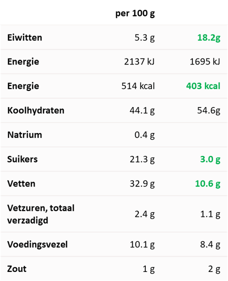 Met de groentechips (links) uit dit voorbeeld zie je dat dit product 3x zoveel vet, 7x zoveel suikers en 25% meer calorieën bevat dan de popped chips (rechts) van Food2Smile. En waar je bij deze groentechips 5,3 gram eiwitten eet, is dat bij de chips van Food2Smile die een bron van proteïne zijn maar liefst 18,2 gram. Kortom: check de voedingswaarden.