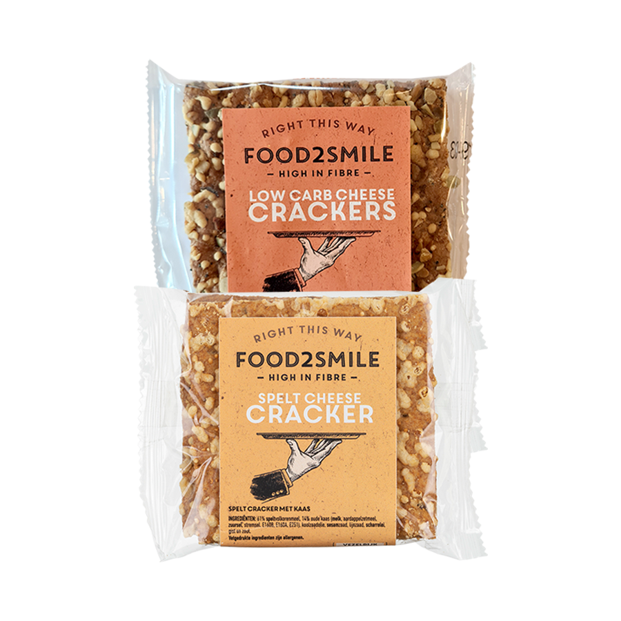 A snack that includes the word “cheese”. Got your attention? For all those moments when you suddenly crave something savoury, pelled cheese crackers is yours. t, responsible s. Without added sugars and high in fibre. The low carb cheese cracker comes with pumpkin seeds. Also rich in fibre and low in carbohydrates. The ideal snack for a strong appetite. A truly responsible snack. Each package contains 2 large crackers.