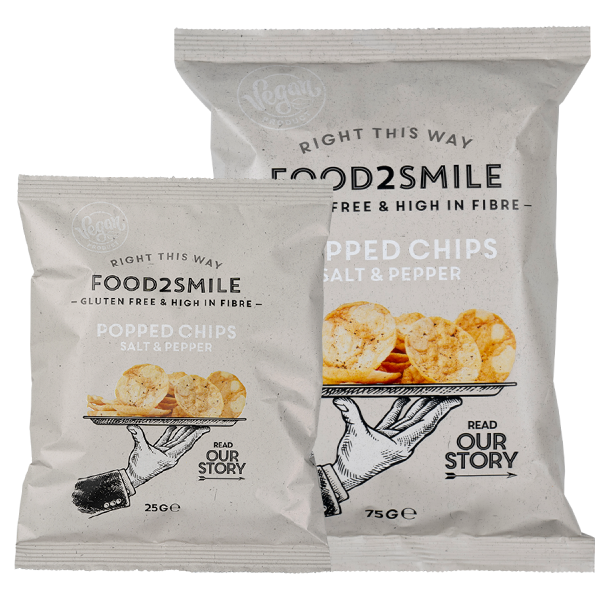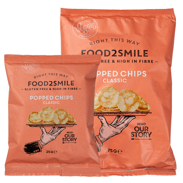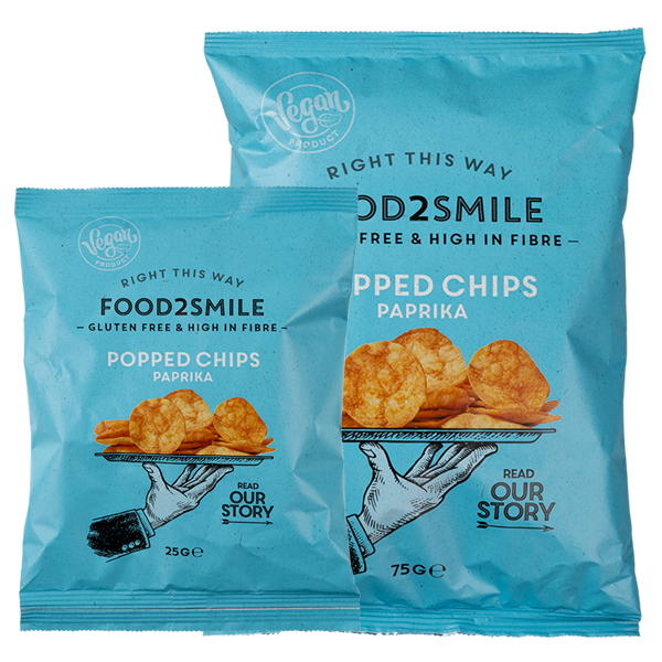 Snack with a smile: all of the proteinโ next to no fat. Our popped chips contain 60% less fat than fried chips. And thatโs not all. They are made with 50% potato and 50% soy, making them a good source of protein. They are gluten free, rich in fibre and contain no added sugars. A genuinely delicious and healthier choice. Indulge yourself guilt free when youโre in the mood for something good!