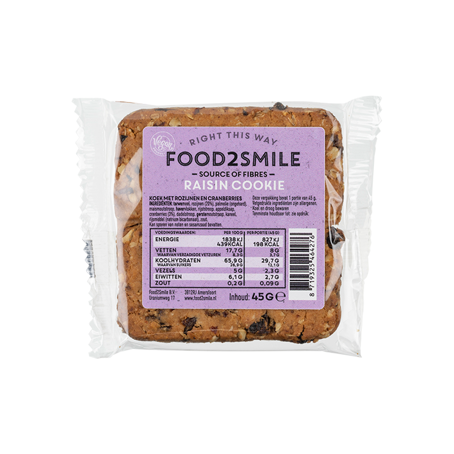 A filling and tasty cookie for serious cravings. Sweet because of the raisins and cranberries, no added sugars. If a product contains 3 grams of fibre, you can call it “source of fibre”. Our Raisin Cookie contains 5 grams. A guilt-free raisin cookie that is easy for on the go. A winner if you ask us.